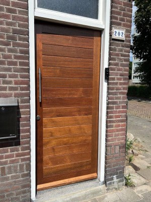 De JV 1400D van het merk Java is een degelijke en stijlvolle voordeur, vervaardigd uit massief hout (merbau) met een standaard dikte van 38 à 40 mm. De deur wordt geleverd met stijlen en dorpels van 140 mm breed, en is verkrijgbaar in verschillende afmetingen. Hij kan vooraf behandeld worden met een grondlaag of transparante behandeling, waarna een aflak aanbevolen is.
