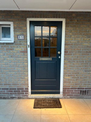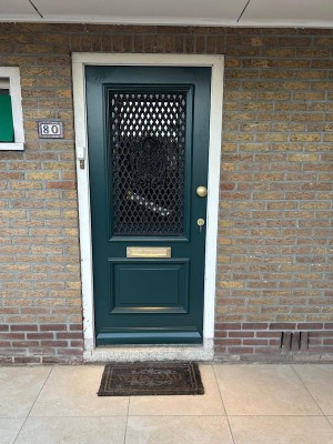 Om het in stijl af te maken is er gekozen voor een messing getrommelde voordeur veiligheidsset. Dit messing getrommelde deurbeslag is bij ons favoriet en verkopen we regelmatig bij zo'n mooie voordeur met rooster en is ook speciaal afgestemd op rooster voordeuren. De kruk aan de binnenzijde is namelijk iets korter dan bij de reguliere deurbeslag voordeursets, waardoor het draairaam voor het rooster makkelijk geopend kan worden.